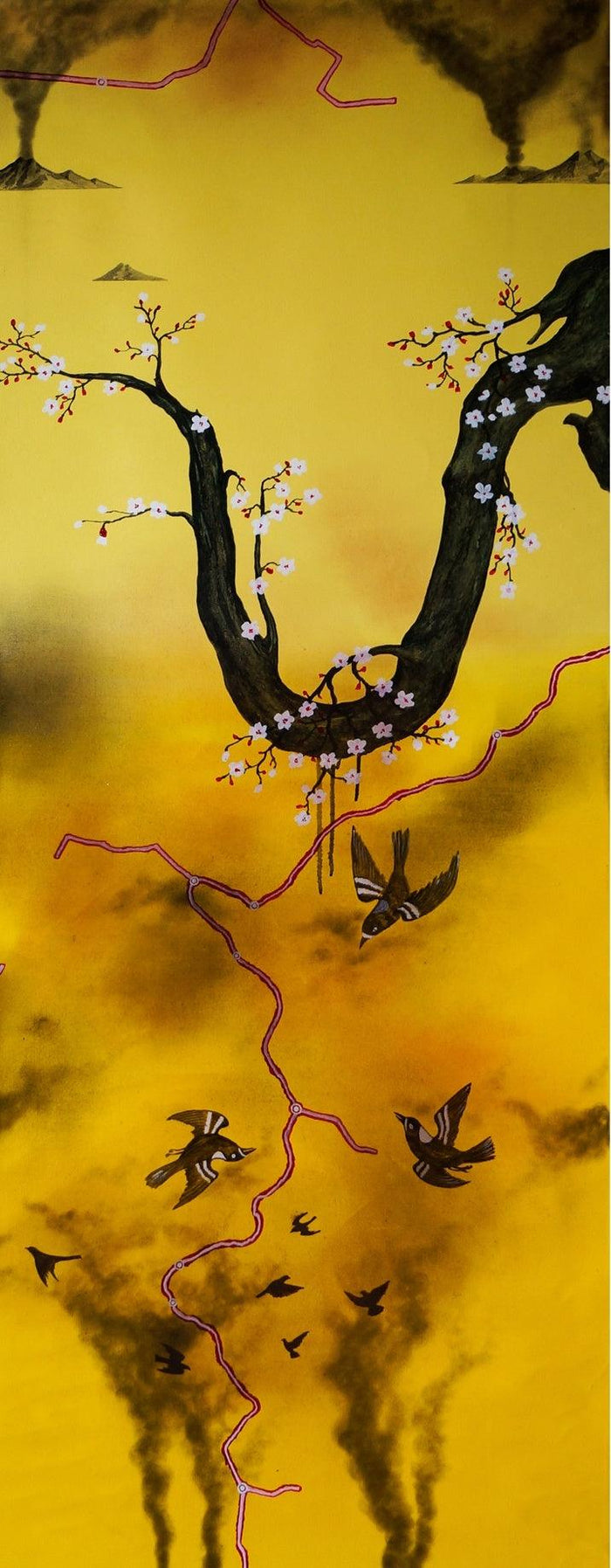 The painting presents a surreal landscape dominated by a striking yellow sky, creating a dreamlike and otherworldly atmosphere. A gnarled tree trunk extends diagonally across the composition, its branches bare except for a few delicate white blossoms. Several birds, rendered in dark silhouettes, are scattered throughout the scene, some perched on the tree, others in flight. Thin, red lines crisscross the landscape, adding a geometric element to the otherwise organic forms. In the distance, dark, swirling formations rise from the horizon, resembling smoke or storm clouds, adding a touch of drama and mystery. The artist's use of color and composition creates a visually captivating and enigmatic scene, inviting the viewer to interpret its symbolic meaning.