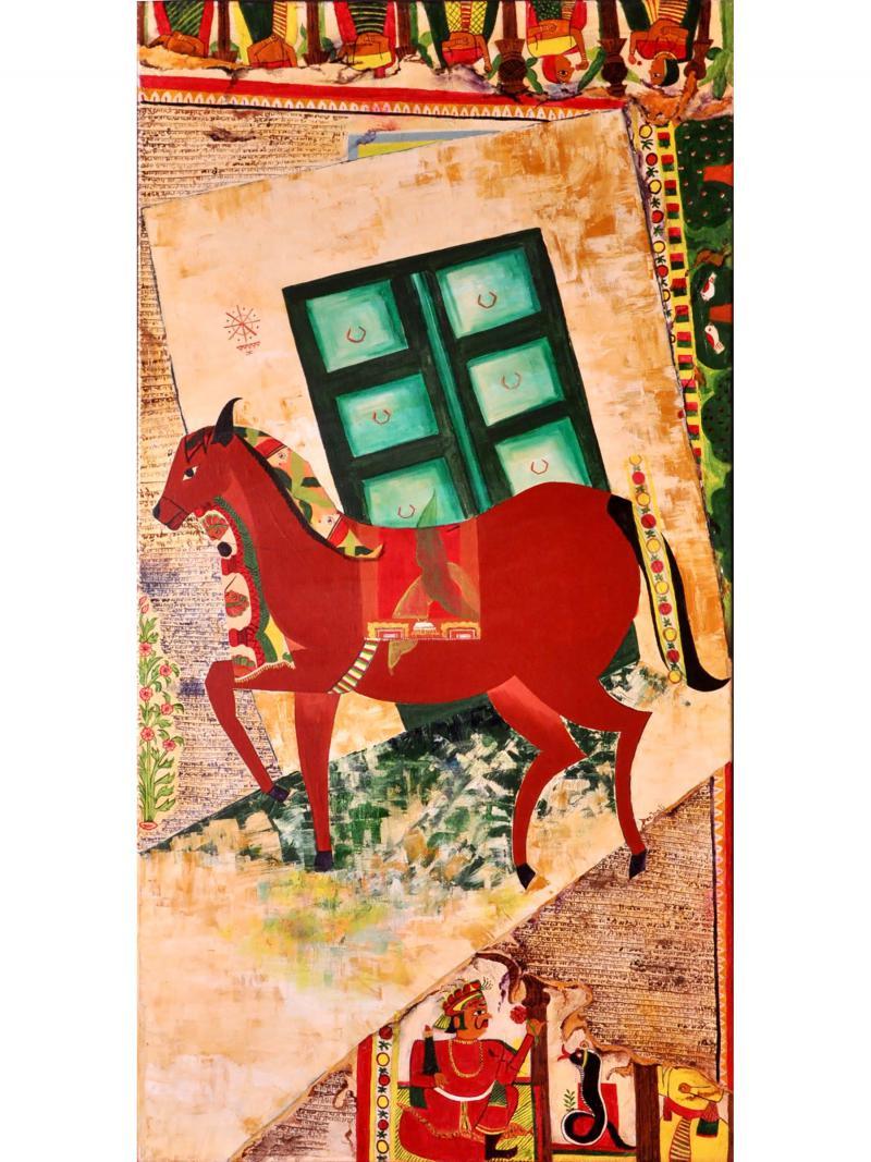 This vibrant painting, rendered in a folk art style, features a stylized red horse adorned with colorful patterns and a decorative saddle. The horse stands proudly against a textured background, adding depth and visual interest to the composition. The artwork captures the essence of rural Indian art traditions, celebrating the beauty and strength of the horse while incorporating traditional motifs and design elements. The painting's bold colors and intricate details create a captivating visual experience, inviting viewers to appreciate the rich cultural heritage of folk art.