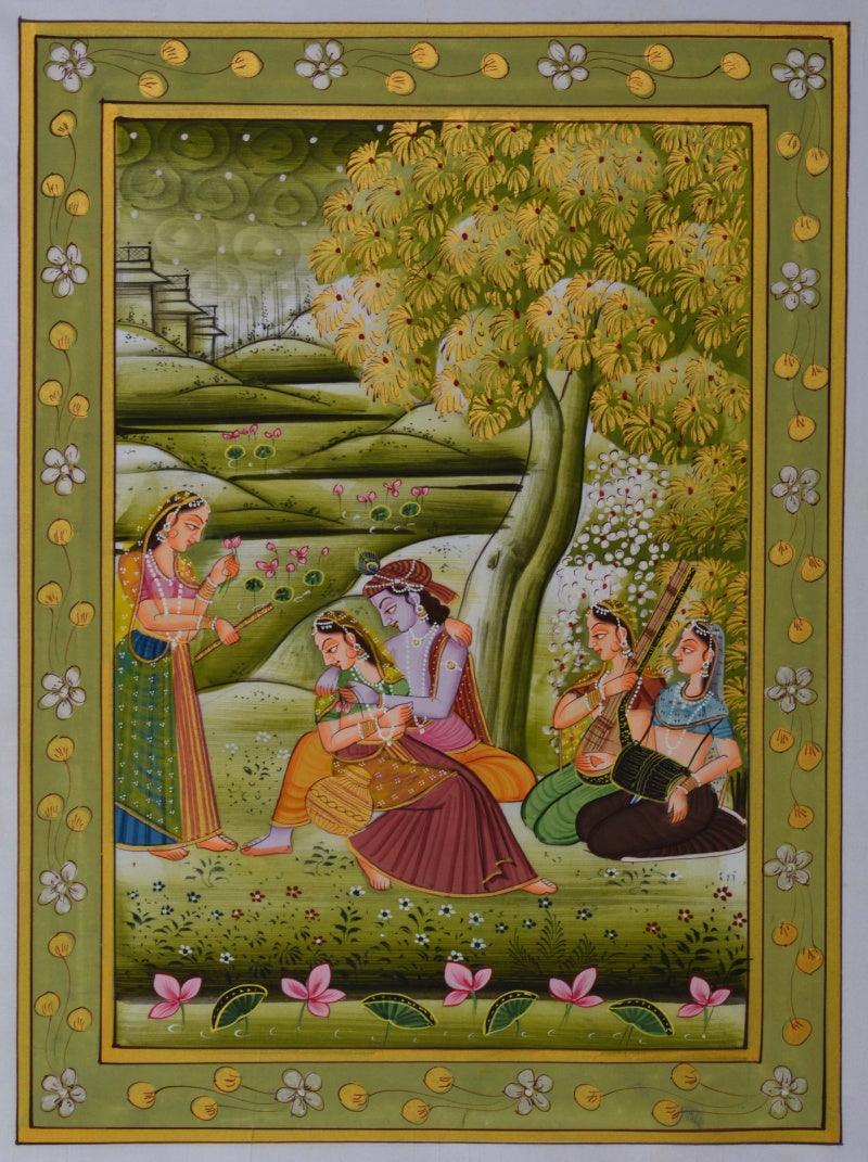 Krishna With Shy Radhaji (Radha Krishna with Gopis in a Garden) Miniature Religious Traditional Art