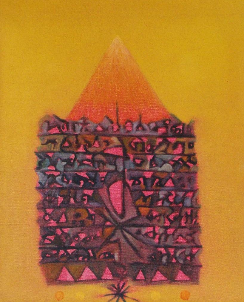 This abstract painting features a central pyramid-like form rising from a base of intricate patterns and shapes. The pyramid is rendered in warm, vibrant hues of yellow and orange, while the base is a complex interplay of lines, shapes, and textures in shades of pink, purple, and gray. The overall effect is one of depth and mystery, inviting contemplation of the underlying symbolism and structure.