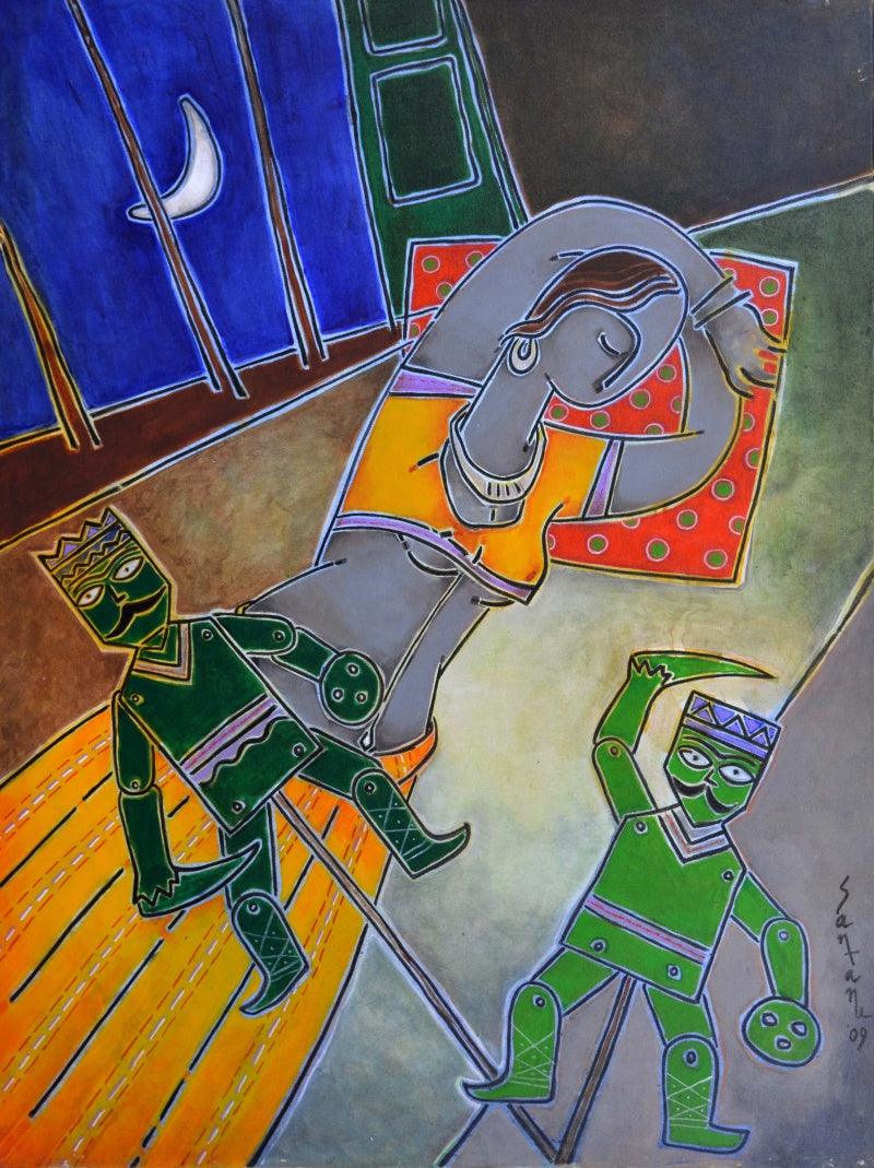 The painting by Santanu Nandan Dinda depicts a woman sleeping peacefully, while two puppet-like figures dance around her. The moon hangs in the night sky, casting an ethereal glow over the scene. The vibrant colors and bold lines characteristic of the artist's style create a sense of dreamlike wonder. The painting evokes a sense of mystery and the subconscious, inviting viewers to explore the depths of their own imaginations.