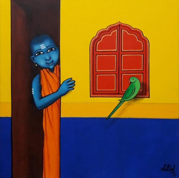"Gurukul Boy With Friendly Parrot", Figurative PaintingVendor: