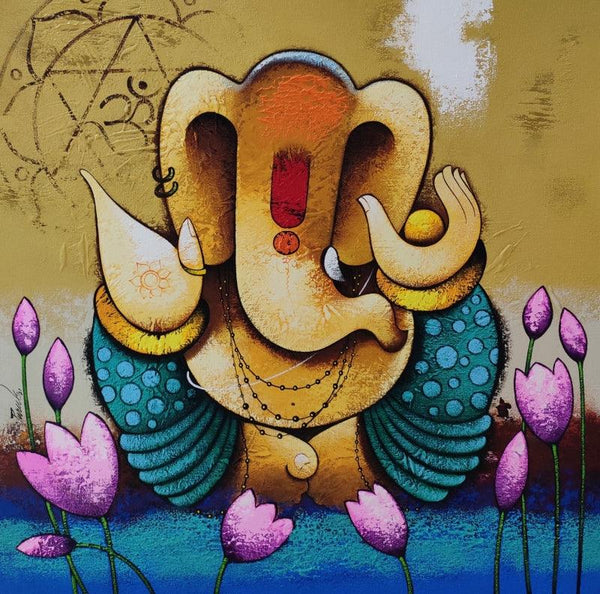 'Lord Ganesha' religious acrylic painting by artist Paras Parmar, 24x24 inch, on canvas