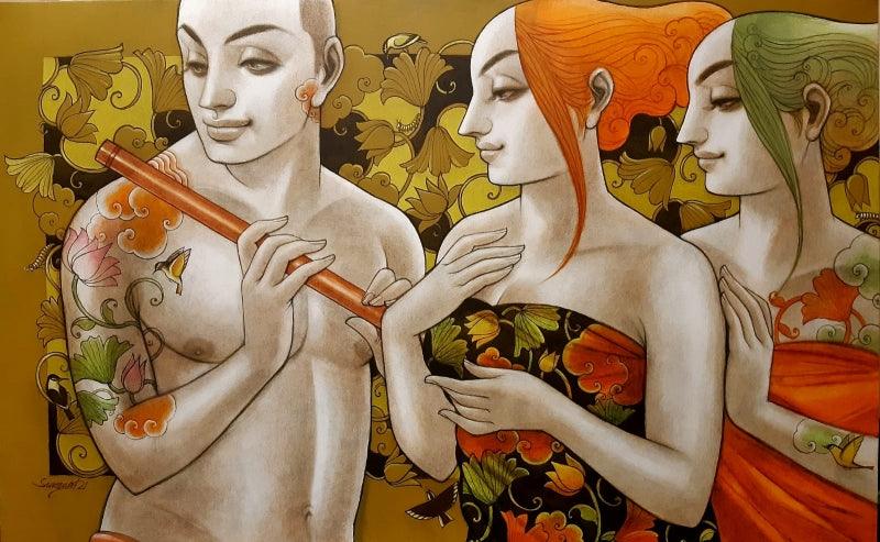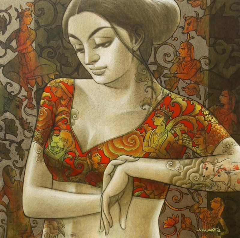 Juxtaposing the mundane with the exotic, Das’ work is usually figurative. His pieces have a surreal quality about them, possibly due to the palette he employs. His acrylics on canvas are moments captured in time, and have a photo-realist quality. His women, though, are highly stylized, with large droopy eyes, long noses and sharp features. Das often places these women in idyllic garden settings giving his work the surreal and dream-like quality.