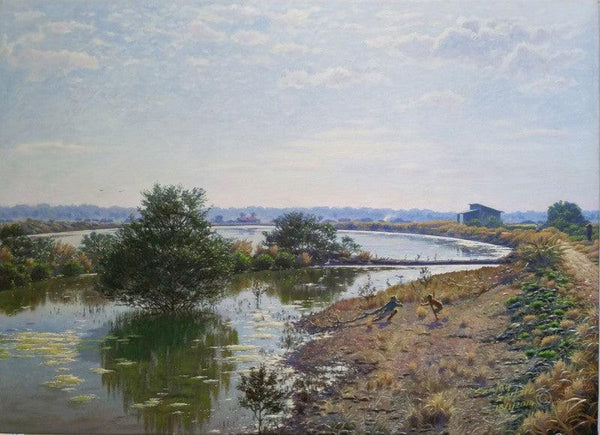 This oil painting captures a vast expanse of golden fields under a soft, diffused light. The scene exudes a tranquil, rural atmosphere with a path winding through the fields, leading to a distant horizon. The artist, Parag Borse, has skillfully rendered the details of the landscape, from the texture of the grass to the subtle variations in the sky, creating a sense of depth and immersion. The overall composition evokes a feeling of peace and harmony with nature.