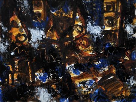 The artwork features an abstract painting that suggests an urban cityscape. The artwork is characterized by a mix of dark, textured forms, predominantly in shades of brown and black, interspersed with splashes of vibrant blue. The composition is dynamic and energetic, with brushstrokes and layered colors creating a sense of depth and movement. Angular shapes and lines hint at buildings or architectural elements. The interplay of light and shadow adds to the visual complexity of the piece. The overall impression is that of a bustling, abstract city, captured through the artist's unique lens. The artist's signature is not visible in the image.