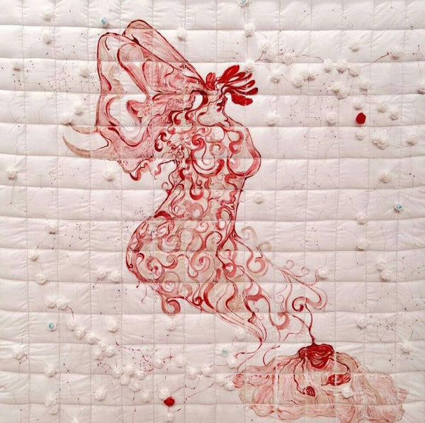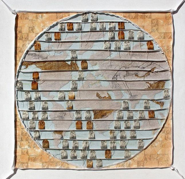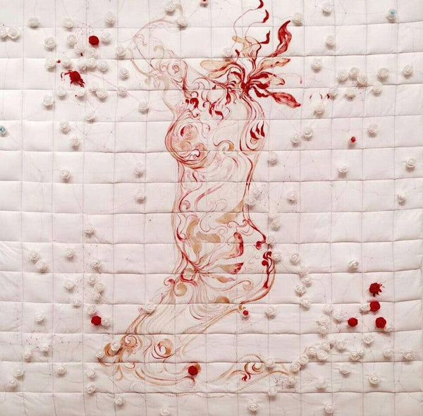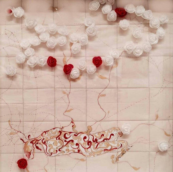 Artwork features an abstract figure, rendered in swirling red lines and patterns, superimposed on an image of Indian 20 Rupee currency. The figure is positioned diagonally across the note, partially obscuring the text and symbols. Below the figure is a circular form with golden leaf-like patterns. The contrast between the vibrant red figure, the detailed currency note, and the golden embellishments creates a visually striking composition. The artwork explores themes of value, both monetary and artistic, and the interplay between abstract form and established symbols. The use of currency as a canvas adds a layer of social or economic commentary to the piece.
