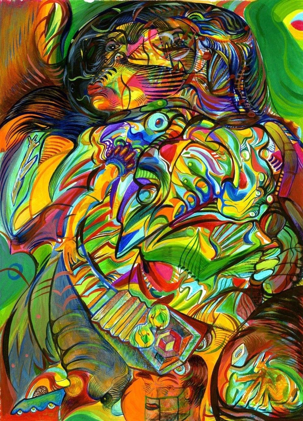 This vibrant and dynamic artwork is a captivating exploration of the human mind and its intricate workings. The artist's use of bold colors and expressive brushstrokes creates a sense of energy and chaos, reflecting the complex and often overwhelming nature of human thought. The intertwined faces and abstract forms suggest a subconscious dialogue, a stream of consciousness that defies linear logic. The painting invites the viewer to delve into the depths of their own psyche and experience the beauty and complexity of the human mind.