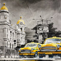 This captivating painting captures the essence of Kolkata, India, on a rainy day. The iconic yellow taxis, a symbol of the city, stand out against the monochromatic backdrop of the cityscape. The towering buildings, adorned with domes and intricate details, add a touch of grandeur to the scene. The artist's skillful use of light and shadow creates a sense of depth and atmosphere, highlighting the reflections on the wet pavement. The overall impression is one of nostalgia and charm, inviting viewers to experience the vibrant energy of Kolkata.