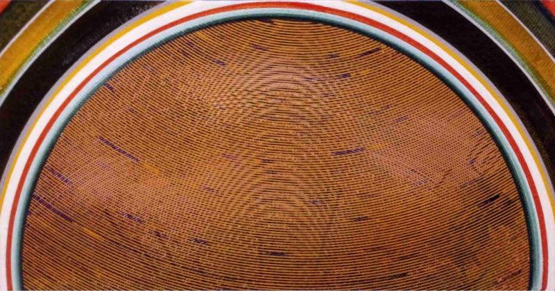 This captivating abstract painting presents a mesmerizing pattern of concentric circles, radiating outward from a central point. The artist has skillfully employed a vibrant palette of colors, creating a dynamic and energetic composition. The intricate details of the pattern, with its overlapping lines and subtle variations in color, invite the viewer to explore the depths of the artwork. The overall effect is a hypnotic visual experience that evokes a sense of wonder and the infinite possibilities of the universe.