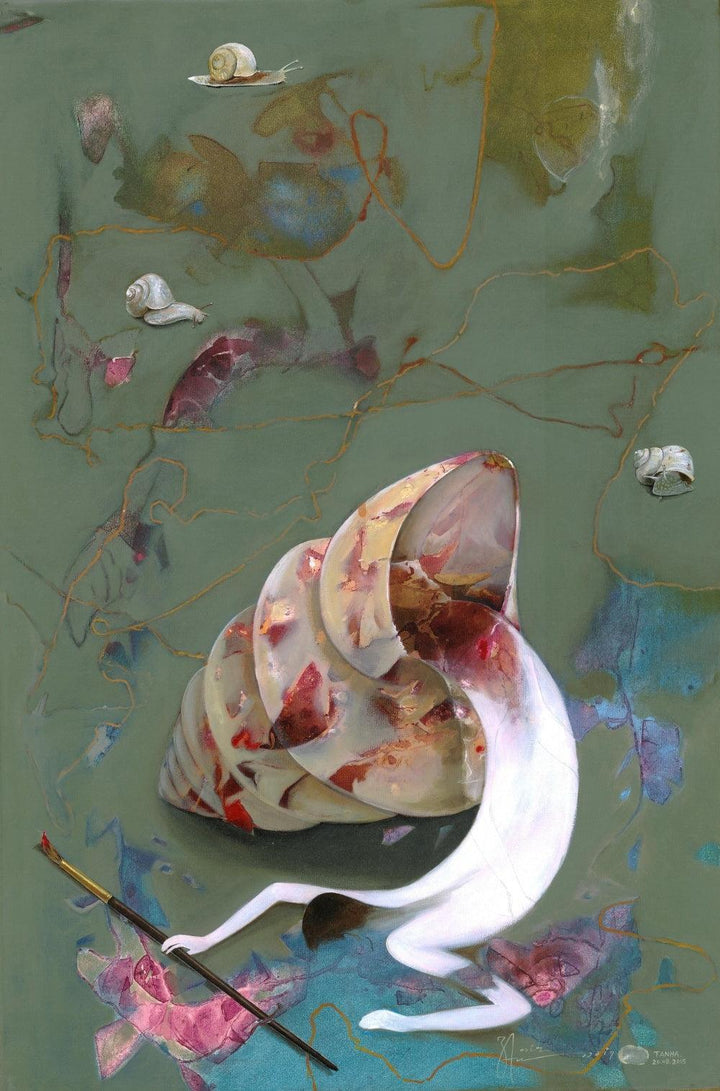 The painting presents a surreal composition featuring a large, segmented snail shell as the primary element. The shell is rendered with detailed textures and a mix of earthy tones, suggesting a sense of age or organic origin. Emerging from the shell is a stylized, elongated figure in white, holding a paintbrush. The figure's posture and the placement of the brush imply the act of creation or expression. Smaller snail shells are scattered across the background, which is a blend of muted greens and abstract shapes. The overall composition evokes a dreamlike or introspective atmosphere, possibly exploring themes of artistic inspiration, the burden of thought, or the slow, deliberate process of creative work.