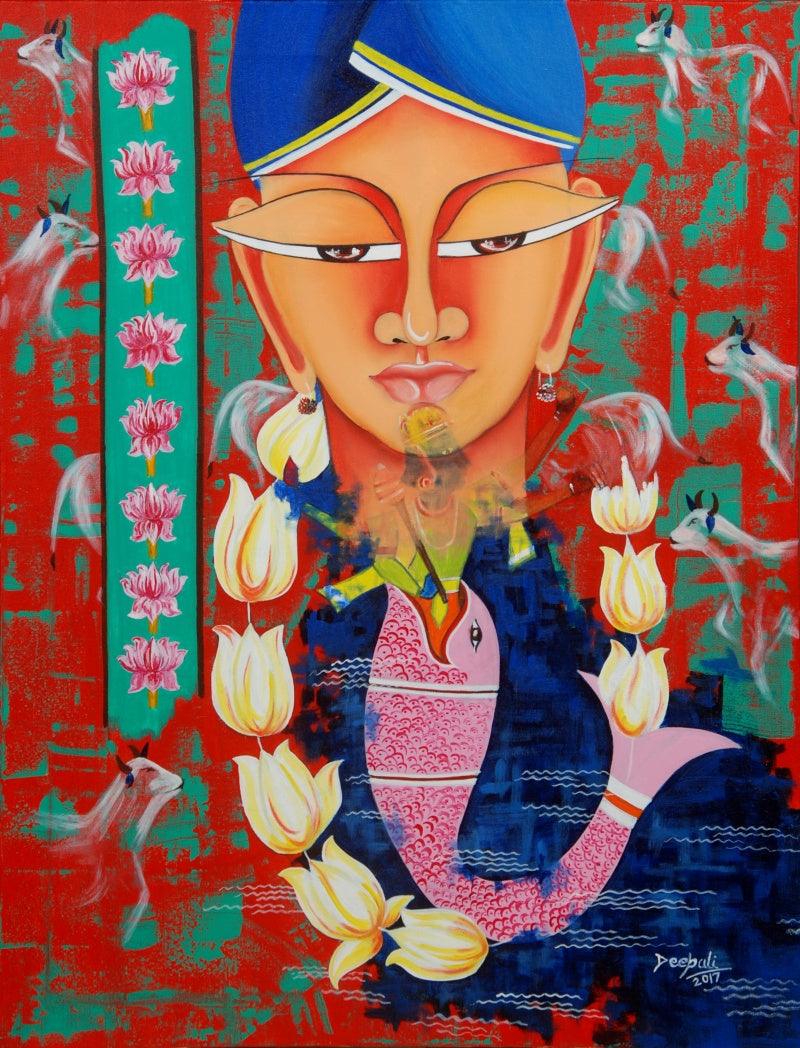 This vibrant painting, titled "Avatar" by Deepali Mundra, features a stylized figure adorned with lotus flowers, gazing upon a fish swimming amidst a sea of blossoms. The bold colors and intricate details create a sense of tranquility and wonder. The juxtaposition of the serene figure with the dynamic fish symbolizes the harmony between stillness and movement, the inner and outer worlds. The painting invites the viewer to contemplate the interconnectedness of all beings and the delicate balance of existence.