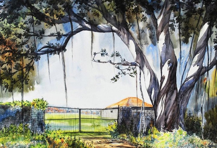 This captivating watercolor painting features a sprawling banyan tree with its roots cascading down, creating a natural gateway to a serene landscape. The intricate details of the tree's bark and leaves are beautifully captured, while the gate and the small structure in the background add a touch of human presence to the scene. The artist's skillful use of watercolors creates a sense of depth and tranquility, inviting viewers to immerse themselves in the beauty of this natural haven.