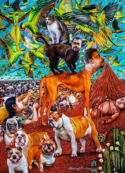 A surreal and thought-provoking painting that blends human and animal forms in a fantastical setting. The central figure, a man with a dog's head, stands amidst a chaotic scene of flying parrots, cats, and dogs. The artist's use of bold colors and expressive brushstrokes creates a sense of energy and dynamism. The composition invites the viewer to contemplate the interconnectedness of all living beings and the blurred lines between human and animal.