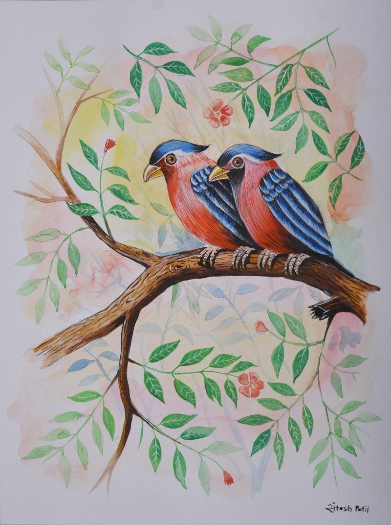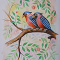 This artwork features two vibrant birds perched on a branch adorned with delicate flowers and lush green leaves. The birds' plumage is a striking mix of blue, red, and white, creating a focal point against the soft, pastel background. The addition of small red flowers and scattered leaves adds a touch of spring-like charm to the scene. The composition, with its emphasis on the birds and their natural setting, celebrates the beauty and vibrancy of nature in springtime.