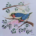 This illustration features two birds perched on a branch, rendered in a naturalistic yet slightly stylized manner. The birds are depicted with detailed plumage, showcasing a blend of blue, green, red, and white hues. They are positioned close together, suggesting a connection or interaction. The branch they perch on is adorned with leaves and small purple flowers, adding to the naturalistic and serene atmosphere of the illustration. The artist's use of line and color creates a visually appealing composition, capturing the beauty and tranquility of the scene.