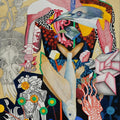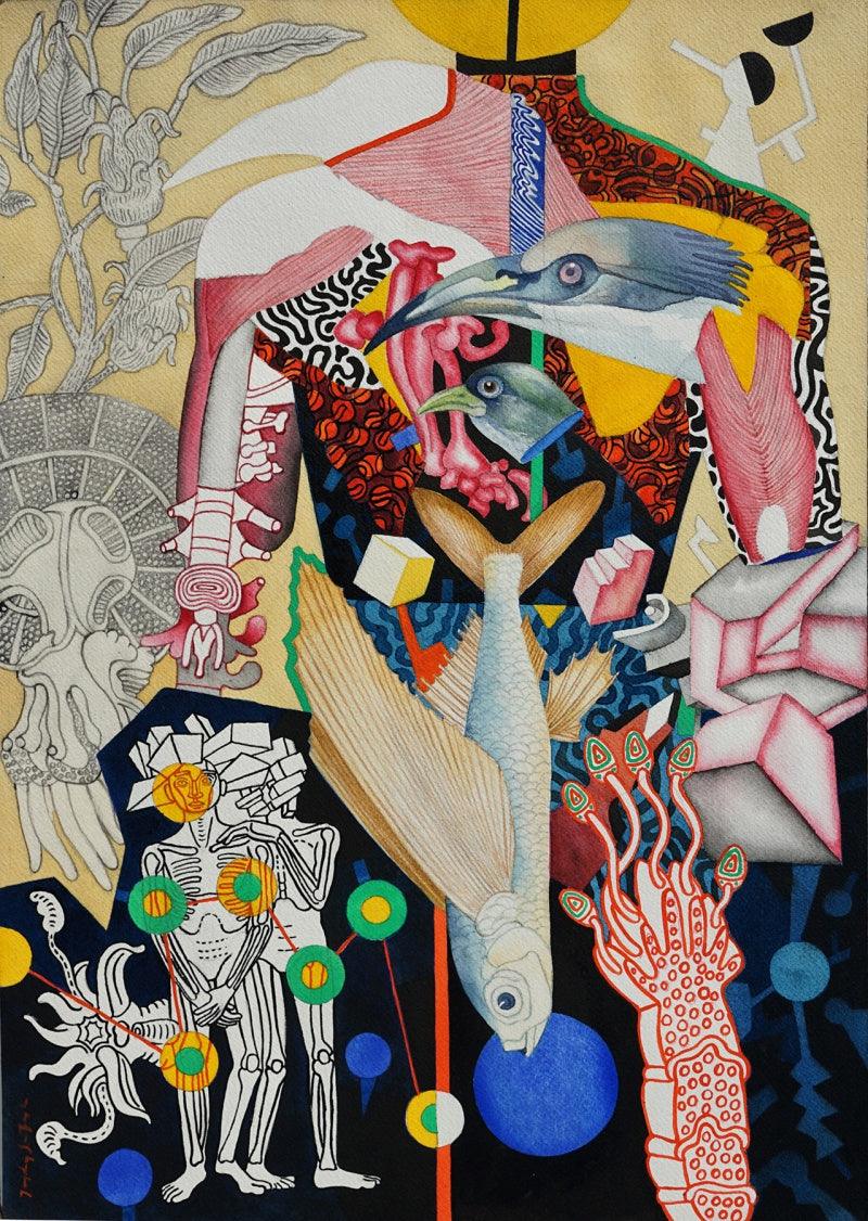 A captivating mixed media artwork by Anjolie Ela Menon that explores the interconnectedness of the human body with the natural world. The artwork features a stylized human form adorned with elements of flora and fauna, including birds, fish, and plants. The intricate details and vibrant colors create a sense of wonder and the intricate balance of the ecosystem.