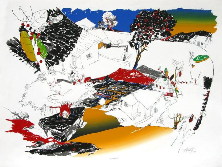 This expressive print captures the beauty and vibrancy of a rural Indian landscape. The artist's bold use of color and dynamic lines create a captivating composition, showcasing the rolling hills, lush vegetation, and charming village homes. A celebration of the natural beauty and cultural richness of the Indian countryside.
