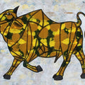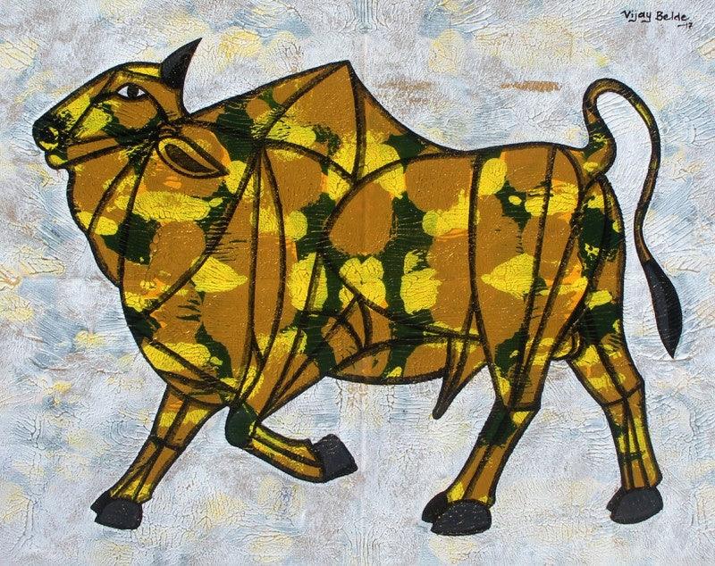 This painting by Vijay Belde presents a bold and stylized depiction of a bull. The animal is rendered in a vibrant palette of golds and blacks, with its form broken down into geometric shapes, creating a dynamic and almost cubist effect. The contrasting background of gold adds to the overall vibrancy and visual impact of the artwork.