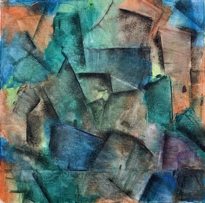 This abstract painting explores the interplay of shapes, colors, and textures. The artist uses a limited palette of blues, browns, and greens to create a sense of depth and dimension. The composition is dynamic and energetic, with forms overlapping and intersecting to create a sense of movement and rhythm.