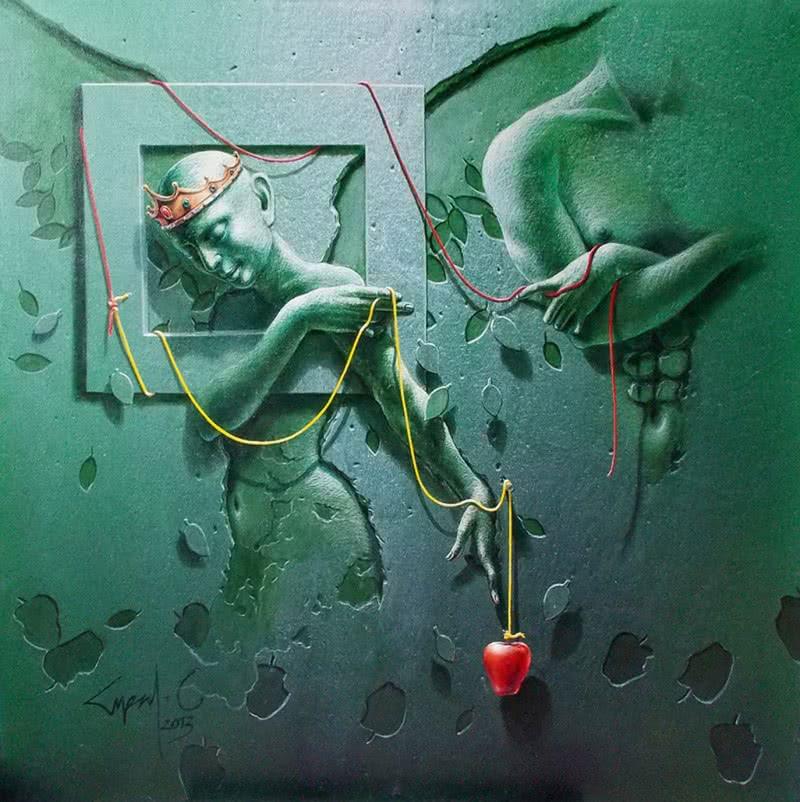 A surreal painting depicting a figure trapped within a frame, reaching out with strings.