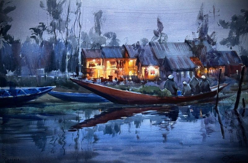 Dal Lake Evening Watercolor Cityscape Painting