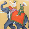 This exquisite miniature painting depicts Indra, the Hindu god of thunder and rain, riding atop his majestic elephant, Airavata. Indra is adorned with a radiant crown and holds a lamp and a fly whisk, symbols of his power and divine status. The vibrant colors and intricate details characteristic of Indian miniature painting bring this scene of celestial grandeur to life.