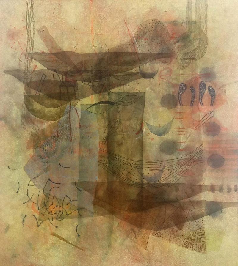 This abstract painting explores the interplay of layered textures and organic shapes, creating a sense of depth and movement. The artist uses a muted palette of browns and greens, with hints of other colors adding subtle accents. Lines, washes, and textured areas combine to create a dynamic composition that invites viewers to explore the visual interplay of forms and textures.