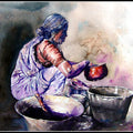Artwork by B. Venugopal captures the essence of everyday life in rural India, depicting a woman diligently washing utensils. The artist's use of watercolors lends a soft and ethereal quality to the scene, highlighting the intricate details of the woman's movements and the surrounding environment. The painting evokes a sense of respect for the simple tasks that sustain life and the resilience of the human spirit.