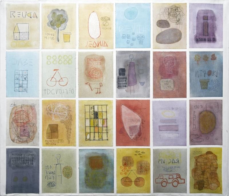 This artwork presents a grid of 16 abstract compositions, each featuring a unique arrangement of shapes, lines, and symbols. The artist employs a limited palette of colors, creating a sense of unity across the grid. The presence of text elements and seemingly symbolic imagery suggests a deeper layer of meaning, inviting viewers to decipher their own interpretations.