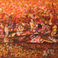 This expressive artwork by Kanwal Krishna captures the energy and exertion of fishermen at work. The scene is rendered in a vibrant palette of reds, oranges, and yellows, creating a sense of intense activity and movement. The figures of the fishermen are intertwined with their nets and the boat, their forms merging with the abstract background. This painting celebrates the resilience and strength of those who work at sea, conveying the challenges and rewards of their labor.