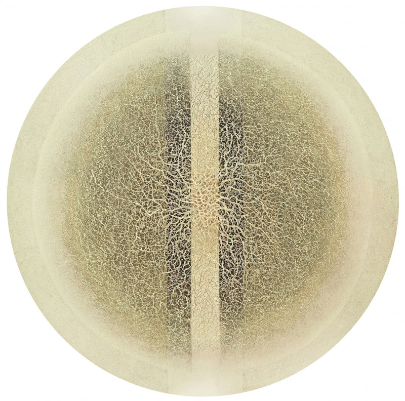 This abstract artwork features a circle with a cracked surface, bisected by a vertical line. The cracks suggest fragility and the passage of time, while the overall circular shape symbolizes the cyclical nature of life, death, and rebirth. The central line could represent a path, a dividing line, or a moment of stillness amidst chaos.