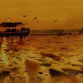 This captivating watercolor painting captures the beauty of a sunset over a tranquil lake. The sky is ablaze with vibrant hues of orange and pink, casting a warm glow on the water's surface. Two boats, silhouetted against the setting sun, add a sense of solitude and peace to the scene. The artist's skillful use of light and shadow creates a sense of depth and atmosphere, inviting the viewer to imagine the sights and sounds of the evening. The overall composition evokes a sense of calm and tranquility, inviting the viewer to appreciate the beauty of nature's ever-changing cycles.