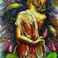This evocative painting captures a woman lost in contemplation by the edge of a stream. Her back is turned to the viewer, creating a sense of mystery and intrigue. She holds a lotus flower, her fingers delicately trailing in the water, as if seeking inspiration from the natural world. The artist's use of soft colors and flowing lines creates a sense of tranquility and harmony, inviting the viewer to share in this quiet moment of reflection.