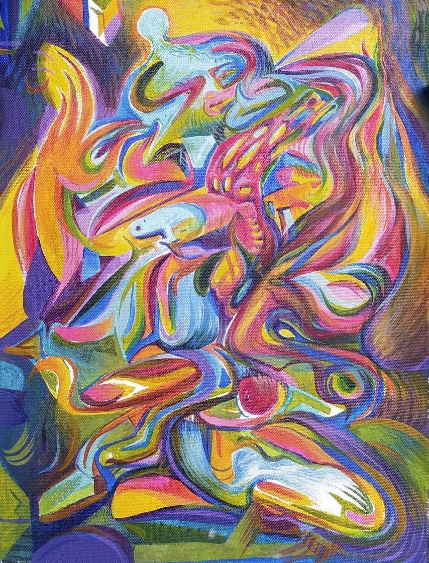 This captivating abstract painting delves into the realm of the surreal, exploring the interplay of human form and cosmic energy. The artist's use of bold, vibrant colors and dynamic brushstrokes creates a sense of energy and movement. The figures, intertwined and distorted, suggest a cosmic dance or a spiritual awakening. The intricate details and symbolic elements invite the viewer to contemplate the mysteries of the universe and the interconnectedness of all things. This artwork is a celebration of the human imagination and the power of art to transcend the boundaries of reality.
