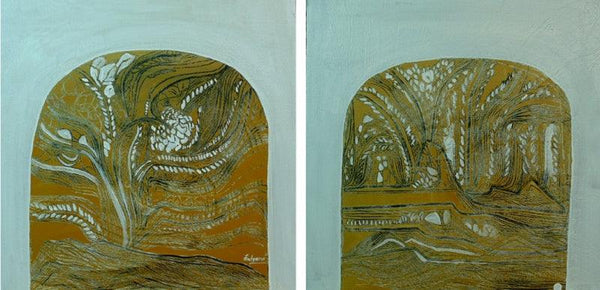 This captivating diptych presents a surreal and dreamlike landscape, dominated by soft pink hues and intricate patterns. The artist's use of delicate brushstrokes and subtle textures creates a sense of ethereal beauty and mystery. The two panels, while connected by a shared color palette and abstract forms, offer distinct visual experiences. The left panel features a more organic and flowing composition, while the right panel presents a more structured and geometric arrangement. The overall composition is both serene and enigmatic, inviting the viewer to explore the depths of the subconscious and the boundless possibilities of the imagination.