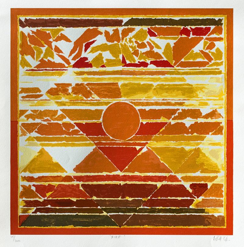 This vibrant abstract painting by Maqbool Fida Husain explores the theme of fire through bold colors and geometric shapes. The use of warm tones, such as red, orange, and yellow, conveys the intensity and energy associated with fire. The artist's signature style, characterized by simplified forms and bold lines, creates a dynamic and expressive composition.
