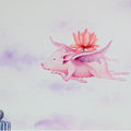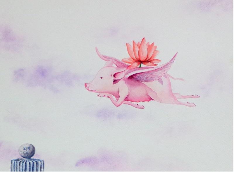 This whimsical artwork depicts a pink pig with delicate wings, gracefully soaring through a soft, pastel-colored sky. Atop its back rests a vibrant lotus flower, adding a touch of elegance and symbolism. In the lower left corner, a small, striped figure with a smiling face looks up in wonder, completing the enchanting scene. The painting evokes a sense of joy, freedom, and the boundless possibilities of imagination.