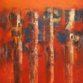An abstract oil painting by Indian artist Mahesh Vyas. The artwork evokes a landscape with a focus on vertical forms reminiscent of towering structures or trees silhouetted against a vibrant red sky. The artist employs a textured technique, creating a sense of depth and movement within the composition. The painting conveys a sense of awe and wonder, perhaps inspired by a dramatic natural scene.