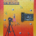 The painting features a complex composition with a variety of elements. A prominent camera on a tripod takes center stage, aimed at a female figure who appears to be posing or performing. The background includes a stage-like area with the word "IMPARTIAL" spelled out, as well as a large eye motif. Various tools and geometric shapes are scattered throughout the composition. The artwork suggests a commentary on the act of observation, objectification, and the power dynamics inherent in the gaze, particularly in relation to performance and impartiality. The diverse elements create a visually rich and thought-provoking scene, inviting interpretation and reflection on these themes.