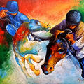 This captivating painting showcases a skilled rider astride a powerful horse. The artist has skillfully captured the energy and movement of the horse and rider, conveying a sense of speed and grace. The use of bold colors and expressive brushstrokes adds dynamism to the scene. The painting evokes a sense of freedom and the thrill of equestrian sport.