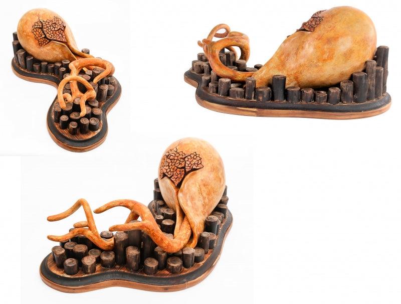 This triptych depicts a unique sculptural representation of a seed awakening and bursting forth into life. The organic forms and intricate details, crafted from wood and other natural materials, evoke a sense of wonder and awe at the process of creation and the interconnectedness of all living things.