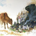 This evocative painting depicts a scene of devotion and reverence in a temple complex, where a devotee offers prayers and food to a sacred cow. The cow, a symbol of abundance and spiritual purity, gently accepts the offering, while a majestic Nandi statue stands guard in the background. The artist skillfully captures the interplay of light and shadow, creating a sense of tranquility and spiritual connection. The muted tones and hazy atmosphere evoke a sense of timelessness and tradition.
