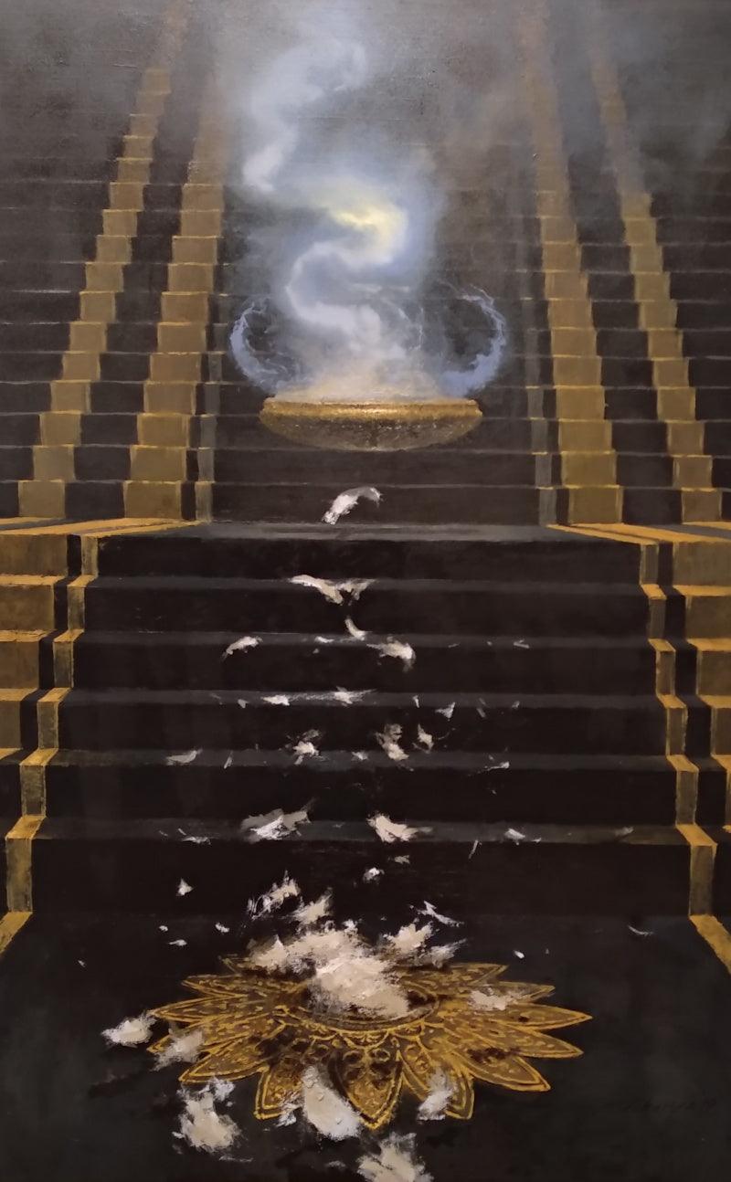 "Stairway to Light" by Shreyas Shinde depicts a symbolic pathway towards spiritual enlightenment. The painting features a grand staircase leading up to a luminous source of light, shrouded in mist, suggesting a journey of self-discovery and transcendence. The use of contrasting dark and light tones creates a sense of depth and mystery, while the scattered white feathers symbolize purity and spiritual ascension. The artwork invites viewers to reflect on their own personal journeys towards inner peace and illumination.