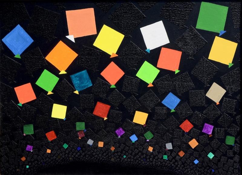 This vibrant and dynamic artwork captures the spirit of childhood and the joy of flying kites. A multitude of colorful kites, each with its own unique shape and hue, soar across a dark, textured sky. The artist's use of bold colors and expressive brushstrokes creates a sense of energy and excitement. The kites, symbolizing dreams and aspirations, seem to dance and twirl in the wind, evoking a sense of freedom and wonder.