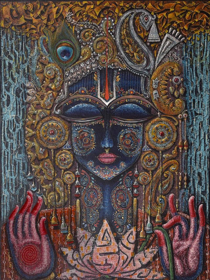 An intricate and mystical portrayal of Lord Krishna, adorned with elaborate ornamentation and symbolic motifs.