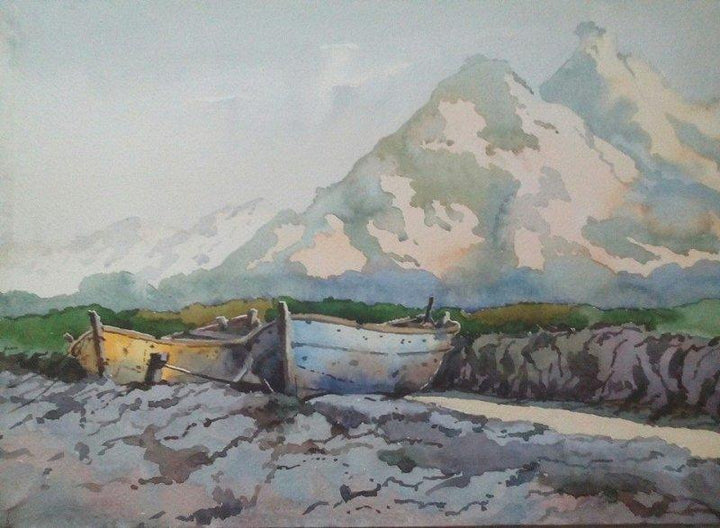 Landscape 16 (Tranquil Mountain Lake with Boats) Watercolor Nature Painting