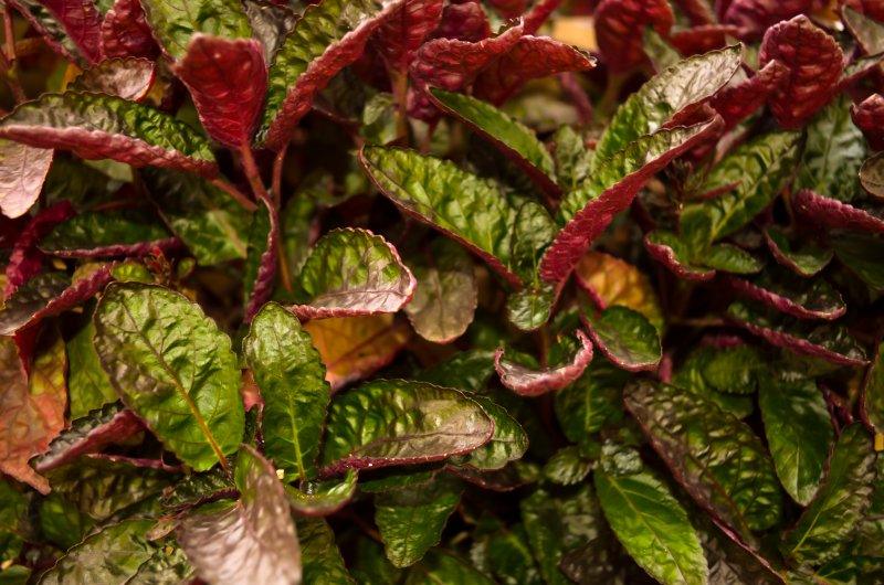 A close-up view of a plant with deep red and green leaves.