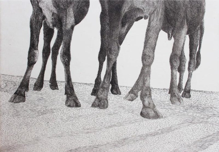 This drawing focuses on the powerful legs of a group of camels as they traverse a sandy desert landscape. The artist has captured the intricate details of the animals' anatomy, from the knobby joints to the rough texture of their skin. The perspective is unique, placing the viewer at ground level, offering a sense of being dwarfed by these majestic creatures.