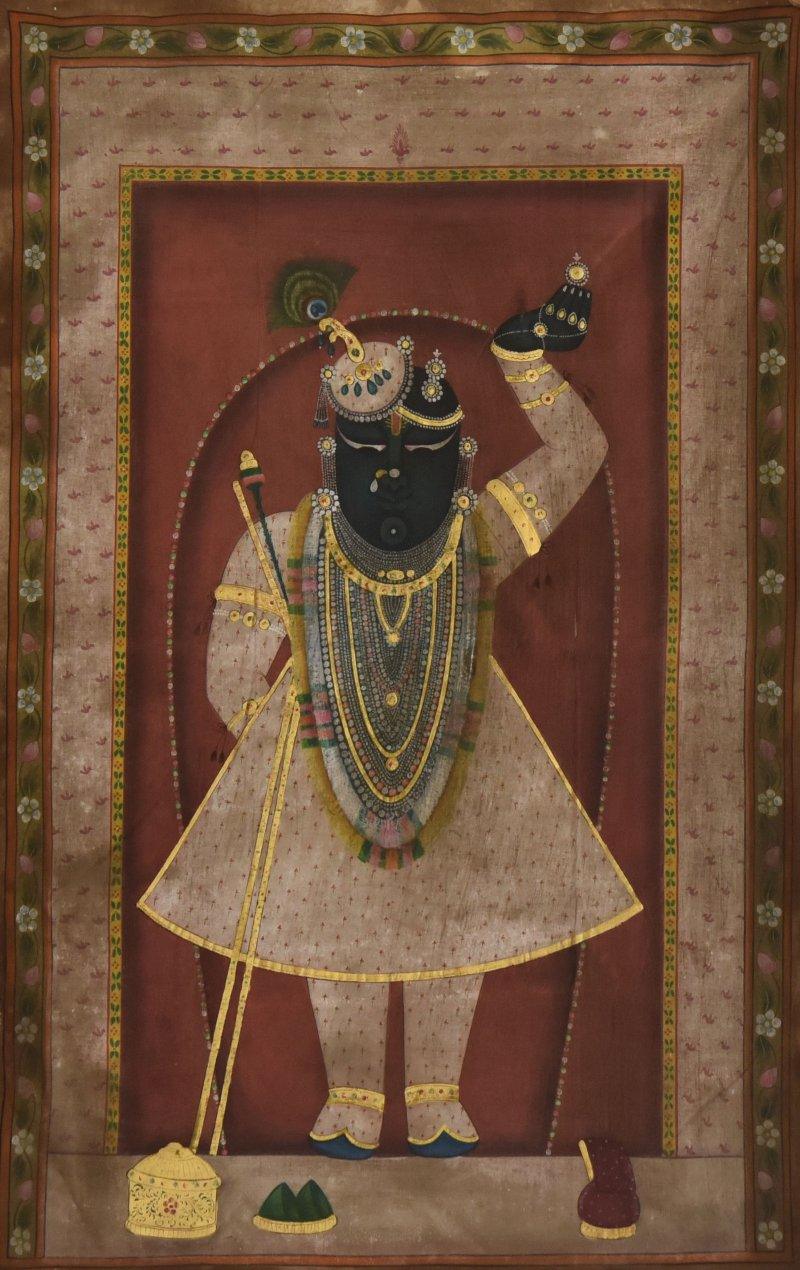 A Pichwai painting depicting Shrinathji, a manifestation of Lord Krishna, in a graceful pose, offering blessings with a raised hand.